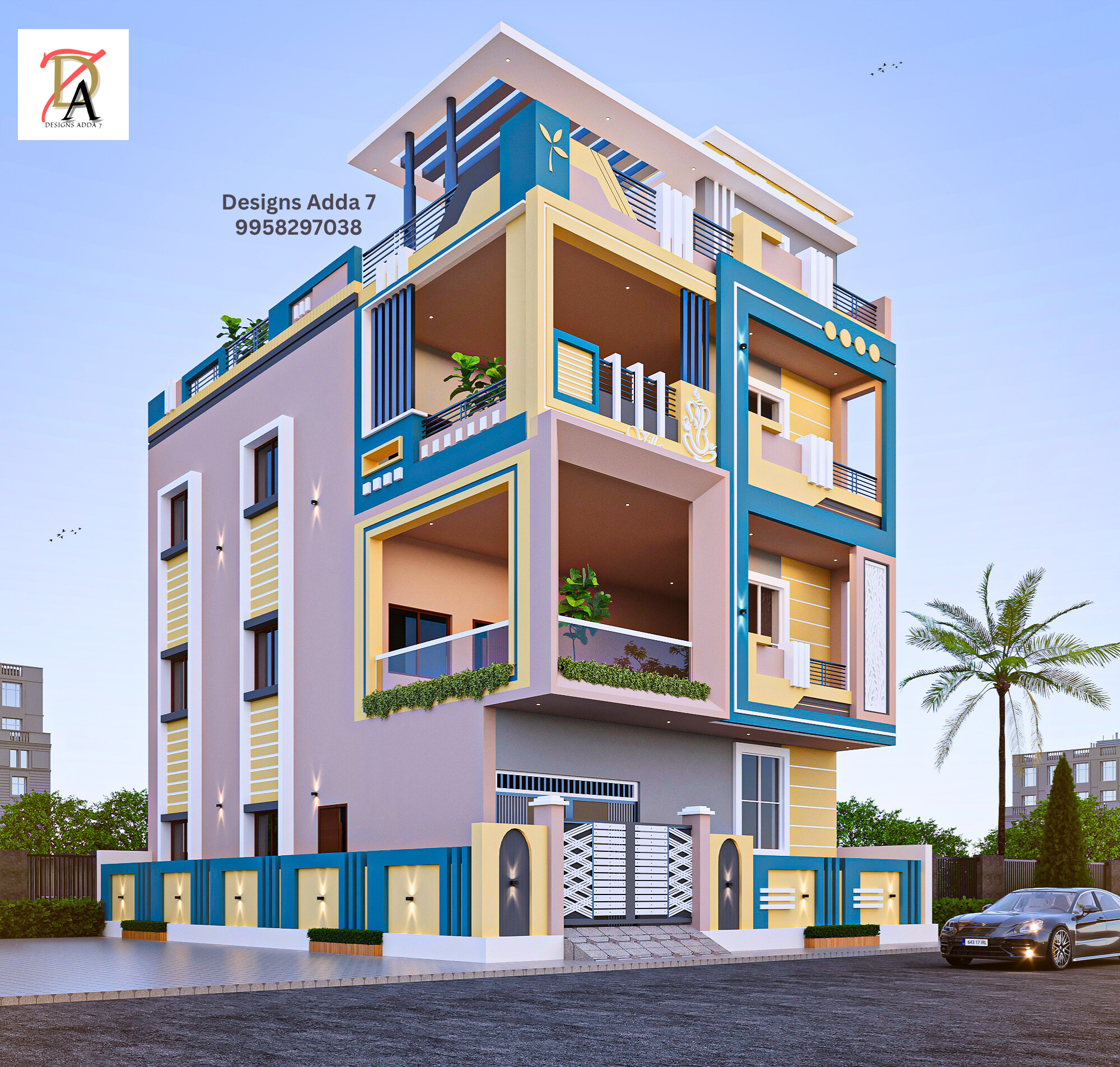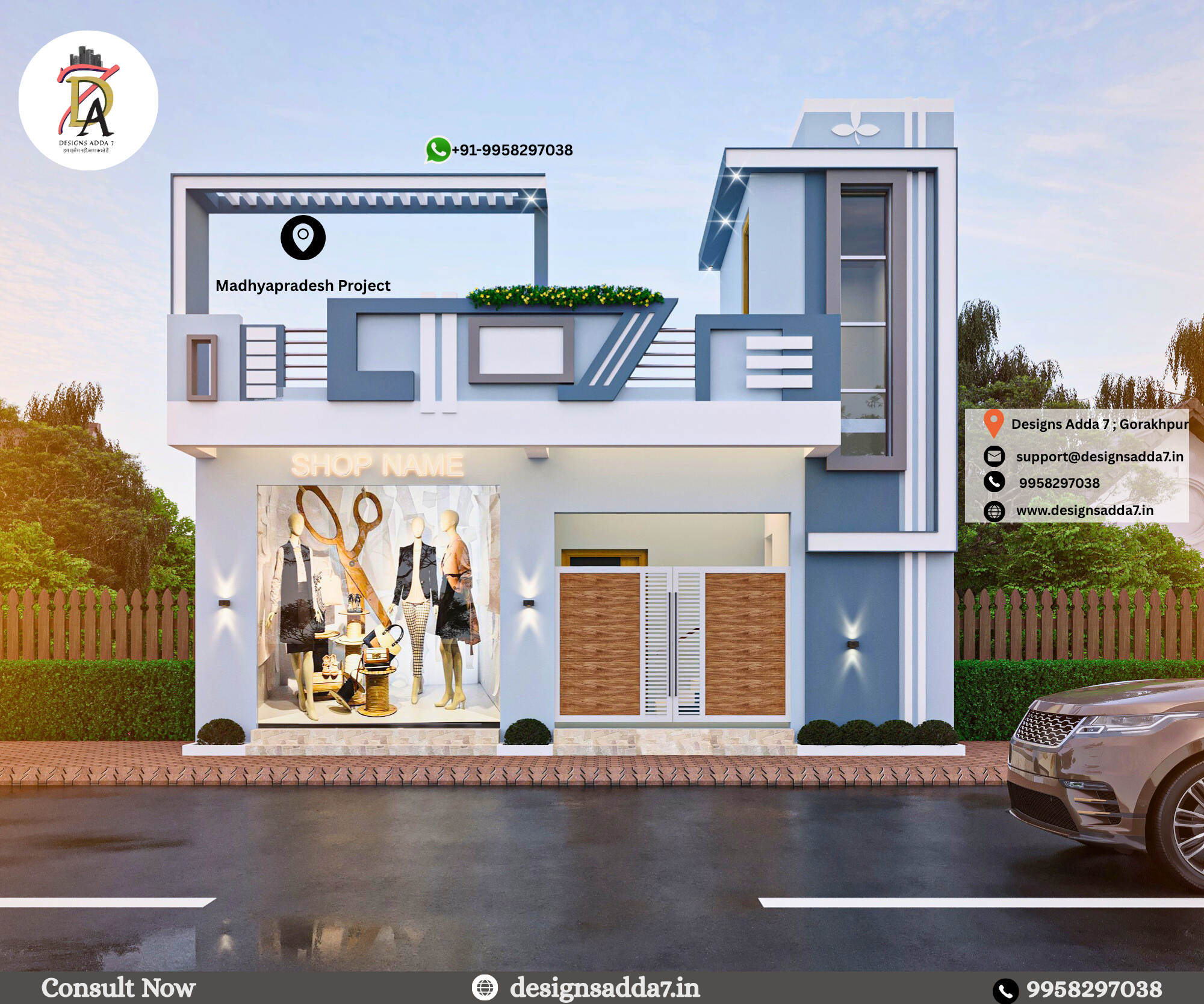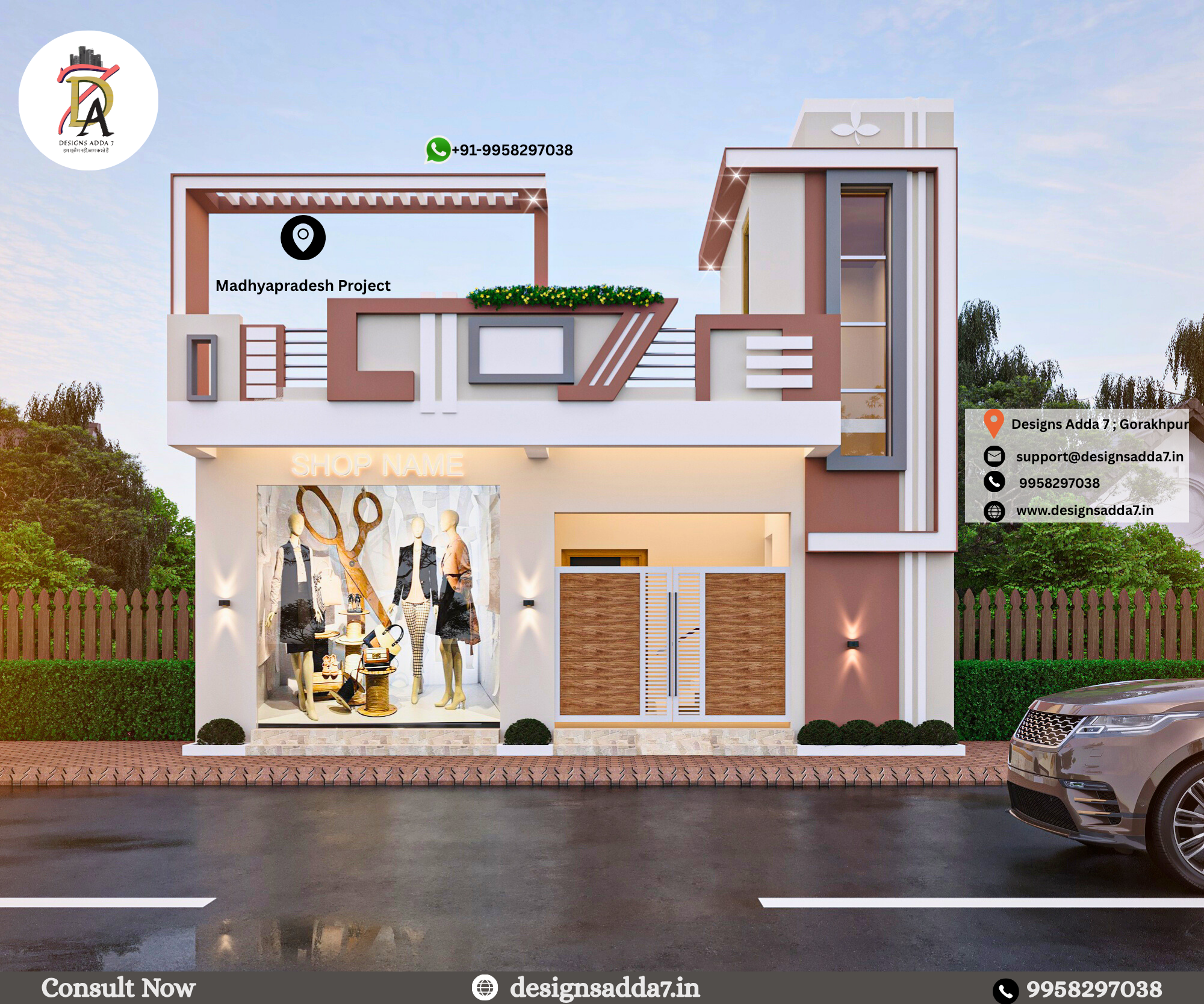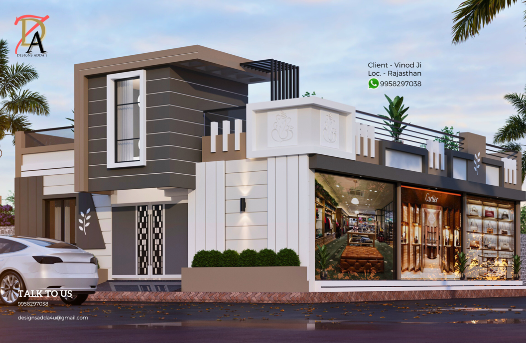 Our Kota corner elevation project seamlessly integrates three commercial shops with a striking color combination that enhances visual appeal. Designed with simplicity in mind, this elevation ensures effortless construction while maintaining a bold, modern aesthetic. Clean lines, balanced proportions, and thoughtfully selected materials create a functional yet eye-catching commercial space, perfect for business visibility and easy execution.